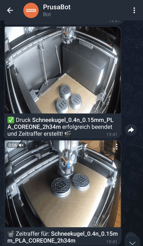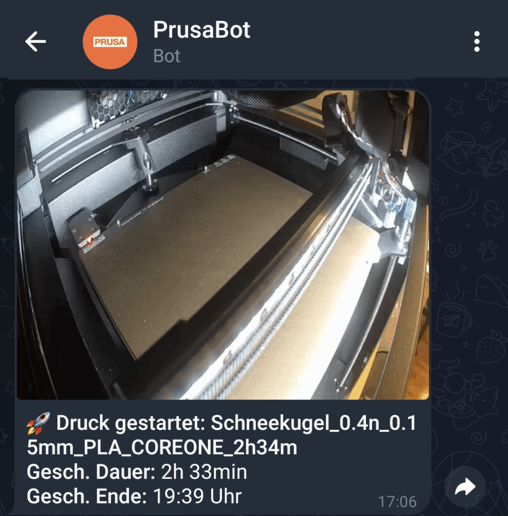 - Zum Start des Drucks ein Foto welches mit weiteren Daten aus der Drucker-API per Telegram geschickt wird