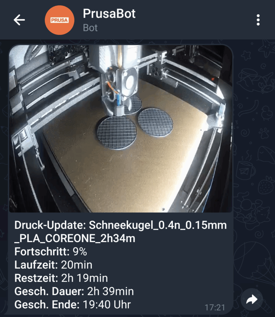 Mein Prusa CoreOne ist leider nicht mehr an OctoPrint angeschlossen, ich wollte aber regelmäßige Telegram Benachrichtigungen und einen Zeitraffer über den Druck haben.